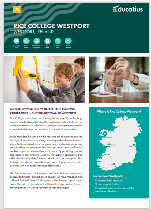 Rice College is a unique and friendly Secondary School for boys located near the beautiful Clew Bay on the west side of Ireland. The college endeavors at all times to develop to the greatest possible extent the intellectual and emotional potential of its members. Being considered a school on the rise, Rice college aims to provide the highest standard of teaching, learning and performance for its students. Students will have the opportunity to develop social and personal skills thanks to a well trained and professional staff which enables pupils to achieve their aspirations. By providing a warm and positive environment, students will acquire confidence and skills necessary for their future academic and personal path. Rice College provides a comprehensive array of physical education